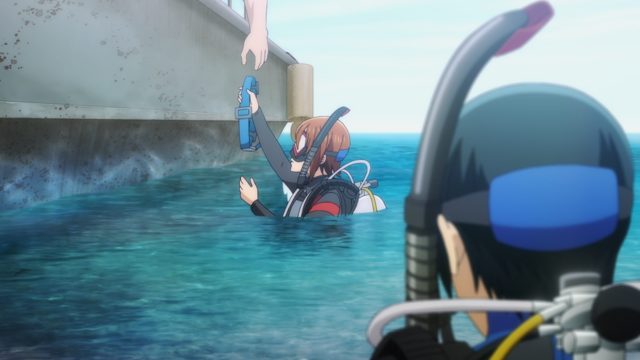そもそも人間の身体自体が水より軽いうえ、前話の感想文でも書いたようにダイビングスーツも水に浮く構造になっているため、装備全体のトータル(たとえば満タンの空気ボンベは水より重い)で適切な浮力になるよう調整しなければ沈むことはできない。